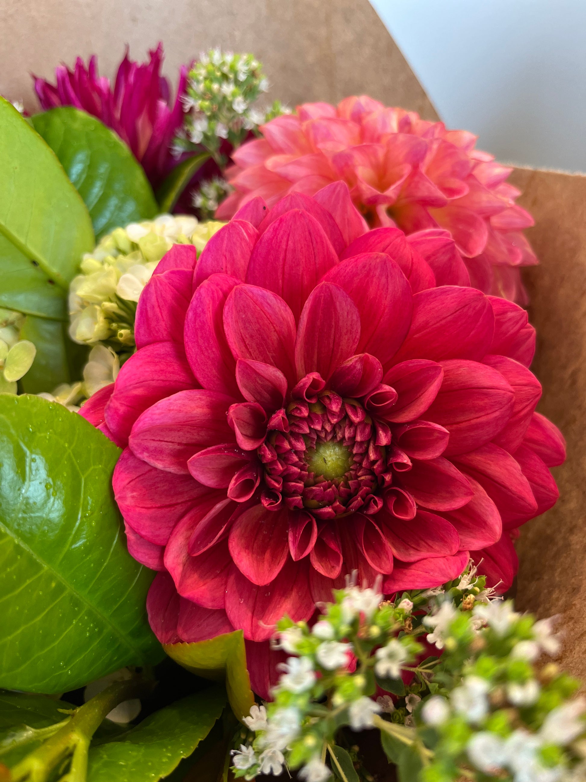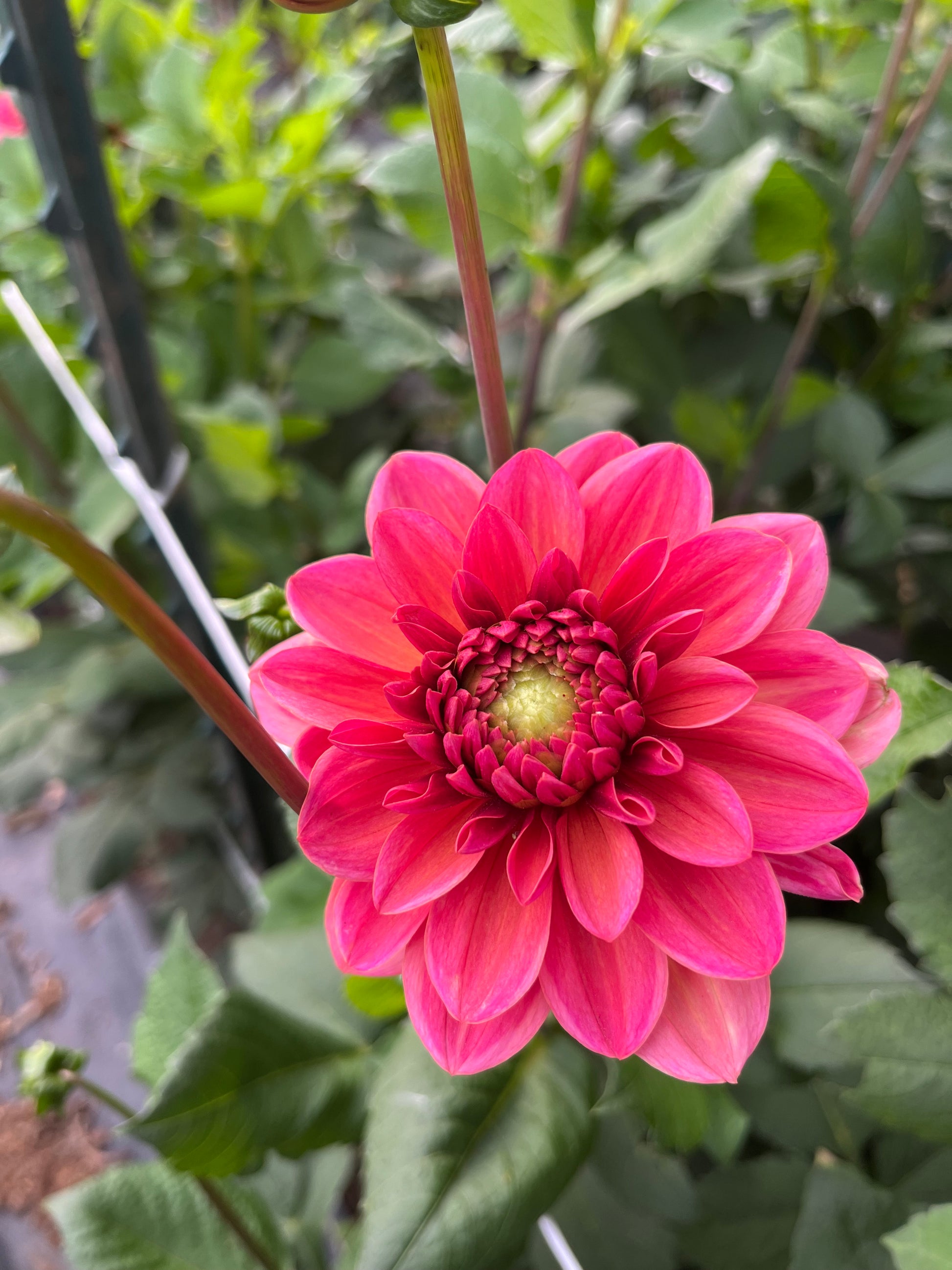 Coral petals with a plum colour on the bottom of the inner petals. Strong stems on shorter plants make this a great garden dahlia.